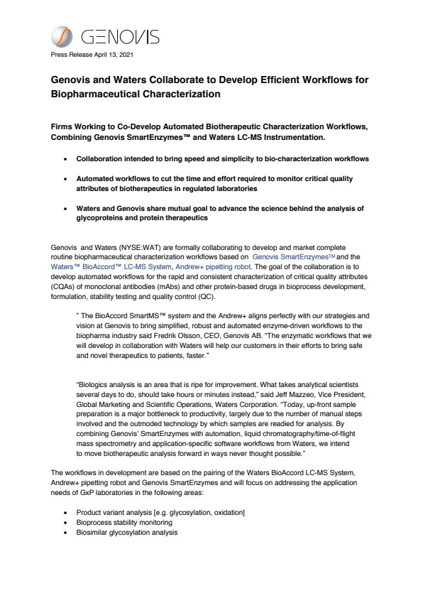 Genovis and Waters (NYSE:WAT) are formally collaborating to develop and market complete routine biopharmaceutical characterization workflows based on Genovis SmartEnzymesTMand the Waters™ BioAccord™ LC-MS System,Andrew+ pipetting robot. The goal of the collaboration is to develop automated workflows for the rapid and consistent characterization of critical quality attributes (CQAs) of monoclonal antibodies (mAbs) and other protein-based drugs in bioprocess development, formulation, stability testing and quality control (QC).