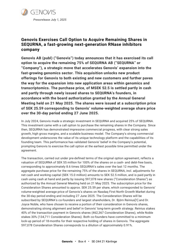 The transaction, carried out under pre-defined terms of the original option agreement, reflects a valuation of SEQURNA of SEK 55 million for 100% of the shares on a cash- and debt-free basis, corresponding to approximately 8.6 times SEQURNA’s sales over the last 12 months. The aggregate purchase price for the remaining 75% of the shares in SEQURNA, incl. adjustments for net cash and working capital (SEK 15.0 million) amounts to SEK 52.5 million, and is paid partly in cash using cash at hand and partly by issuing 597,078 new shares (“Consideration Shares”) as authorized by the Annual General Meeting held on 21 May 2025. The subscription price for the Consideration Shares amounted to approx. SEK 25.59 per share, which corresponded to Genovis’ volume-weighted average price of Genovis’s shares on Nasdaq First North Growth Market during the 30-day period ending and including 27 June 2025. The Consideration Shares will be subscribed by SEQURNA’s co-founders and largest shareholders, Dr. Björn Reinius[1] and Dr. Joyce Noble, who have chosen to receive a portion of their consideration in Genovis shares, demonstrating strong alignment and belief in Genovis’ long-term growth strategy. Reinius stakes 40% of the transaction payment in Genovis shares (462,367 Consideration Shares), while Noble stakes 30% (134,711 Consideration Shares). Both co-founders have committed to a minimum lock-up period of 18-months for their respective holding of shares in Genovis. The aggregate 597,078 Consideration Shares corresponds to a dilution of approximately 0.91%.