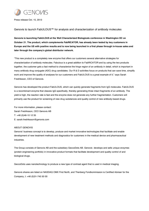 “This new product is a completely new enzyme that offers our customers several alternative strategies for characterization of antibody molecules. Fabulous is a great addition to FabRICATOR and by using the two products together, the customer gets a fast method to characterize the hinge region of an antibody in detail, which is important in many antibody drug conjugate (ADC) drug candidates. Our R & D activities focus on products that can save time, simplify work and improve the quality of analyses for our customers and FabULOUS is a great example of it,” says Sarah Fredriksson, CEO of Genovis.