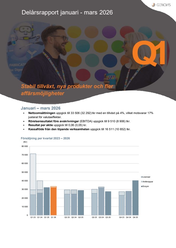 Vi avslutar kvartalet med god finansiell ställning, förbättrad lönsamhet och ett starkt kassaflöde. Även om geopolitisk och makroekonomisk osäkerhet fortsatt utgör ett omvärldsmässigt osäkerhetsmoment ser jag med tillförsikt på Genovis långsiktiga tillväxtmöjligheter. Med ett breddat och stärkt erbjudande inom både Genomics och ADC, ökad aktivitet i Biotech-segmentet och en sund kärnaffär står vi väl positionerade för fortsatt framsteg under 2026.