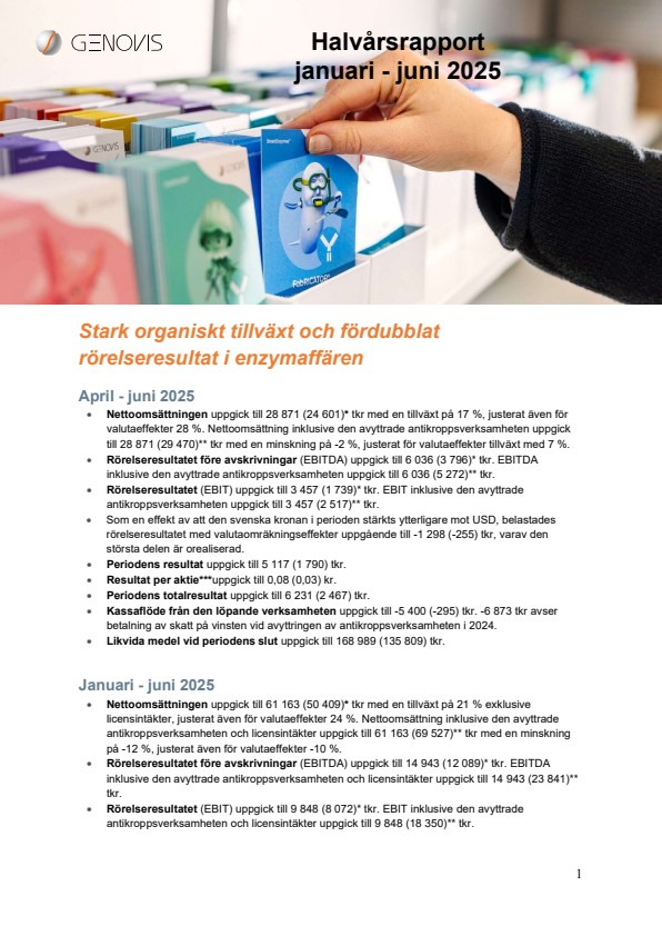 Avslutningsvis vill jag rikta ett stort tack till alla mina kollegor på Genovis. I en tid då omvärlden förändras snabbt visar ni enastående engagemang och förmåga att hålla fokus på det som är viktigast – våra kunder. Med kundfokuserad innovation som ledstjärna bidrar ni varje dag till att utveckla verktyg som hjälper våra kunder utveckla framtidens läkemedel.