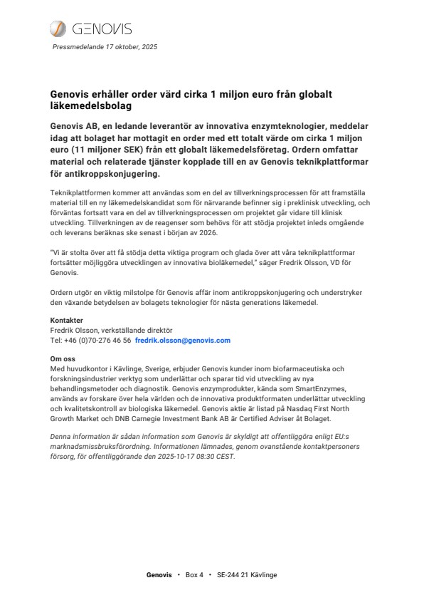 Genovis erhåller order värd cirka 1 miljon euro från globalt läkemedelsbolag