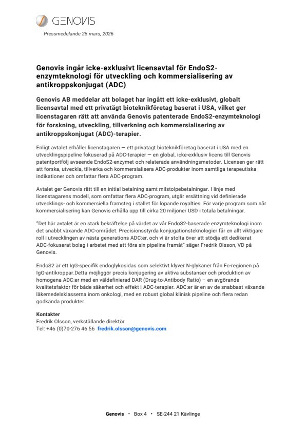 “Det här avtalet är en stark bekräftelse på värdet av vår EndoS2-baserade enzymteknologi inom det snabbt växande ADC-området. Precisionsstyrda konjugationsteknologier får en allt viktigare roll i utvecklingen av nästa generations ADC:er, och vi är stolta över att stödja ett dedikerat ADC-fokuserat bolag i arbetet med att föra sin pipeline framåt” säger Fredrik Olsson, VD på Genovis.