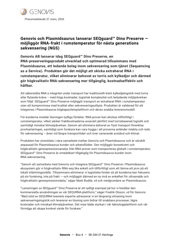 “Lanseringen av SEQguard™ Dino Preserve är ett tydligt exempel på hur vi breddar den kommersiella användningen av vår SEQURNA-plattform,” säger Fredrik Olsson, vd för Genovis. “Med stöd av SEQURNA-teamets expertis adresserar vi en långvarig utmaning inom sekvenseringslogistik och levererar en lösning som bidrar till snabbare processer, lägre kostnader och minskad klimatpåverkan. Det visar både styrkan i vår teknologiplattform och vår förmåga att skapa konkret värde för forskare.”