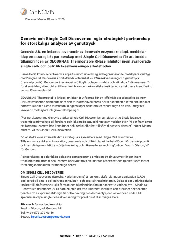 Samarbetet kombinerar Genovis expertis inom utveckling av högpresterande molekylära verktyg med Single Cell Discoveries omfattande erfarenhet av RNA-sekvensering och genuttryck (transkriptomik). Genom partnerskapet möjliggör bolagen snabba och känsliga RNA-analyser för forskarvärlden, vilket bidrar till mer heltäckande mekanistiska insikter och effektivare identifiering av nya läkemedelsmål.
