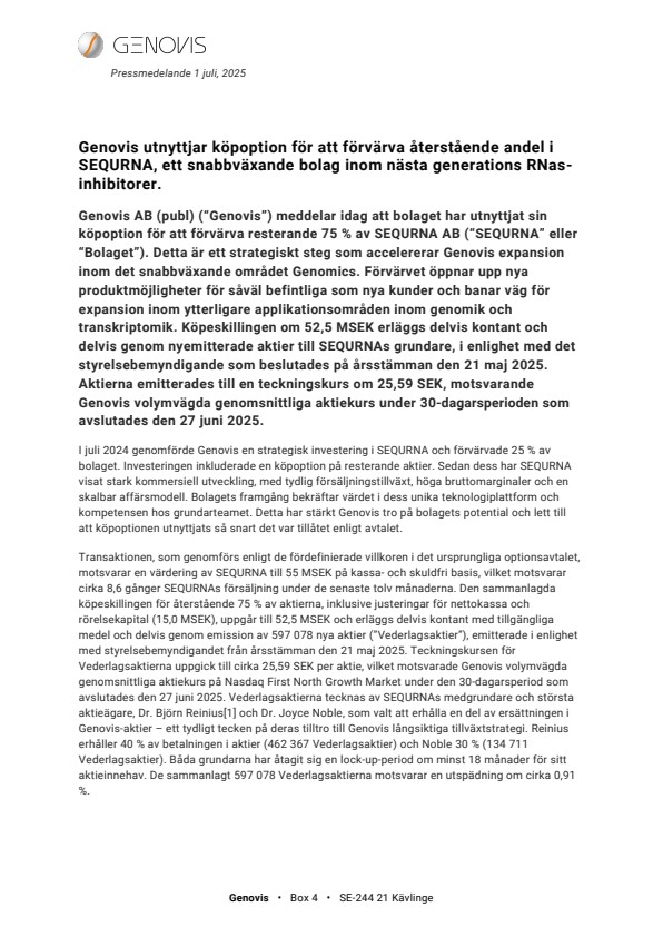 Genovis AB (publ) (“Genovis”) meddelar idag att bolaget har utnyttjat sin köpoption för att förvärva resterande 75 % av SEQURNA AB (“SEQURNA” eller “Bolaget”). Detta är ett strategiskt steg som accelererar Genovis expansion inom det snabbväxande området Genomics. Förvärvet öppnar upp nya produktmöjligheter för såväl befintliga som nya kunder och banar väg för expansion inom ytterligare applikationsområden inom genomik och transkriptomik. Köpeskillingen om 52,5 MSEK erläggs delvis kontant och delvis genom nyemitterade aktier till SEQURNAs grundare, i enlighet med det styrelsebemyndigande som beslutades på årsstämman den 21 maj 2025. Aktierna emitterades till en teckningskurs om 25,59 SEK, motsvarande Genovis volymvägda genomsnittliga aktiekurs under 30-dagarsperioden som avslutades den 27 juni 2025.