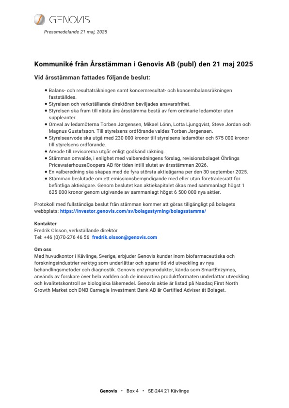 Kommuniké från Årsstämman i Genovis AB (publ) den 21 maj 2025